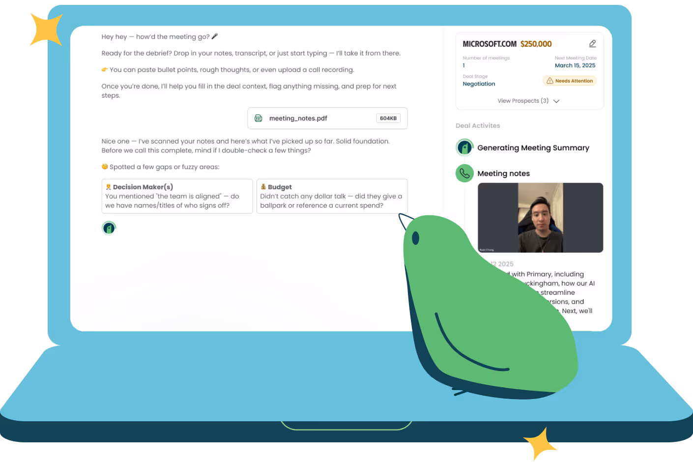 Drop in a call transcript, email thread, or your notes. Chirp will break down the deal, highlight risks, check ICP fit, and show what to do next.